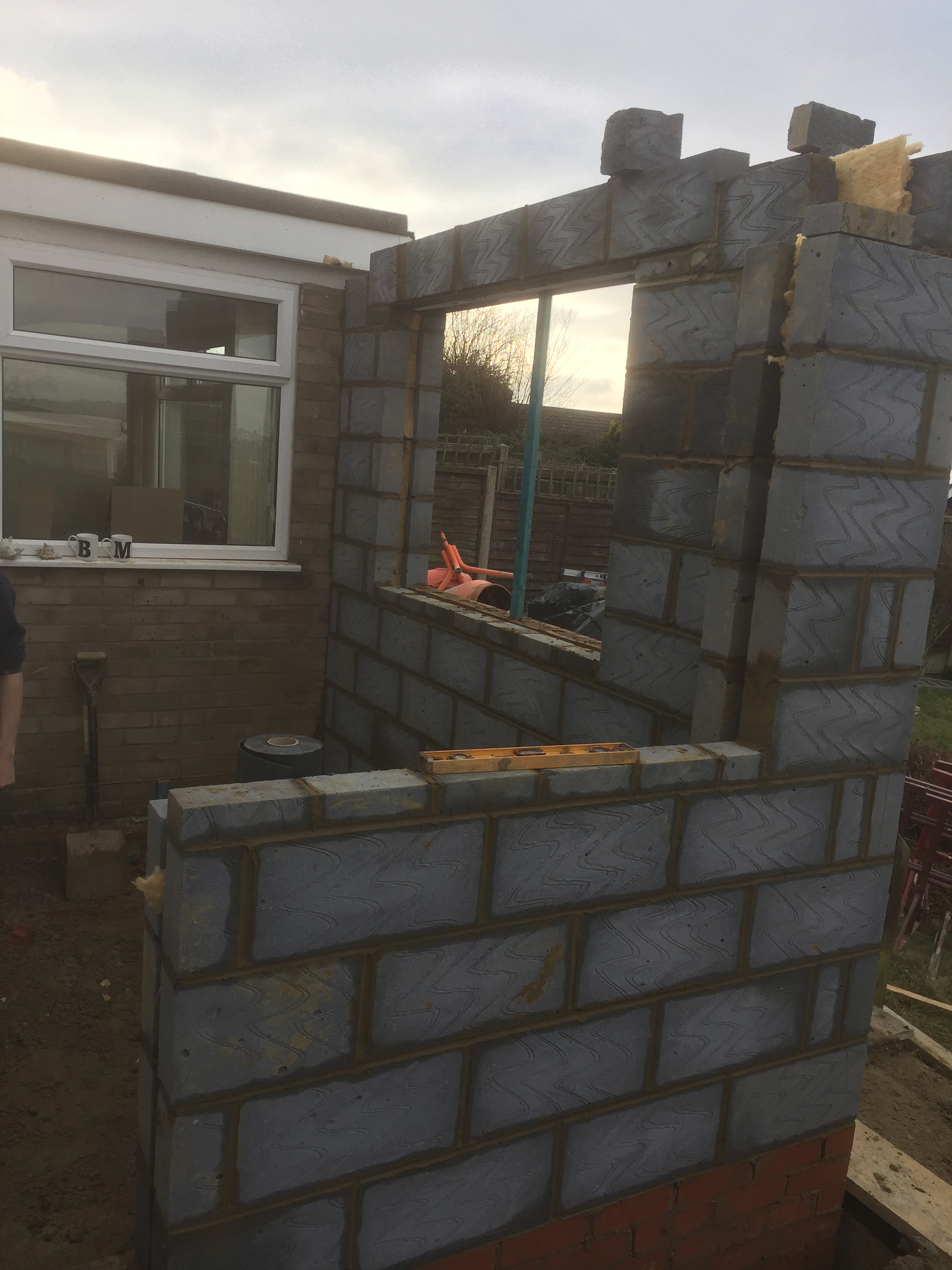 The main structure of the extensions was complete, ready for patio doors and plasteting.